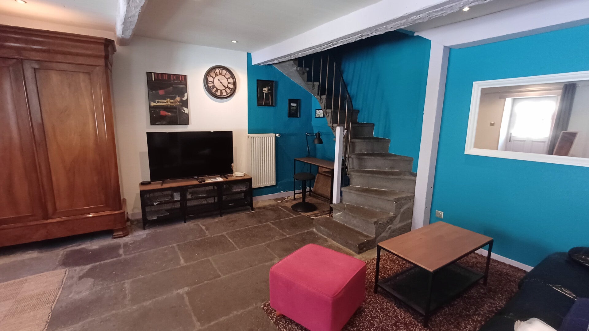 Au rez-de-chaussée, le spacieux salon est idéal pour accueillir jusqu'à cinq personnes, avec un canapé confortable et un fauteuil élégant. Vous pourrez laisser vos manteaux dans une grande penderie au style ancien. Profitez de cet espace convivial pour jouer ensemble, organiser une soirée cinéma ou savourer un apéritif tout en écoutant de la musique. Le rez-de-chaussée est ouvert et partagé par tous les colocataires.